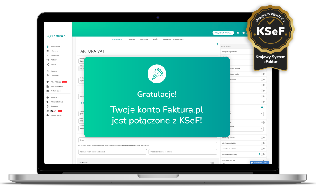 Już od 1 kwietnia 2026 r. korzystanie z faktur elektronicznych w działalności gospodarczej jest obowiązkowe! Faktura.pl to nowoczesny program do fakturowania online z pełną integracją z KSeF. Wystawiaj faktury, przesyłaj je do Krajowego Systemue-Faktur, pobieraj faktury kosztowe i przekazuj dokumenty księgowej jednym kliknięciem.